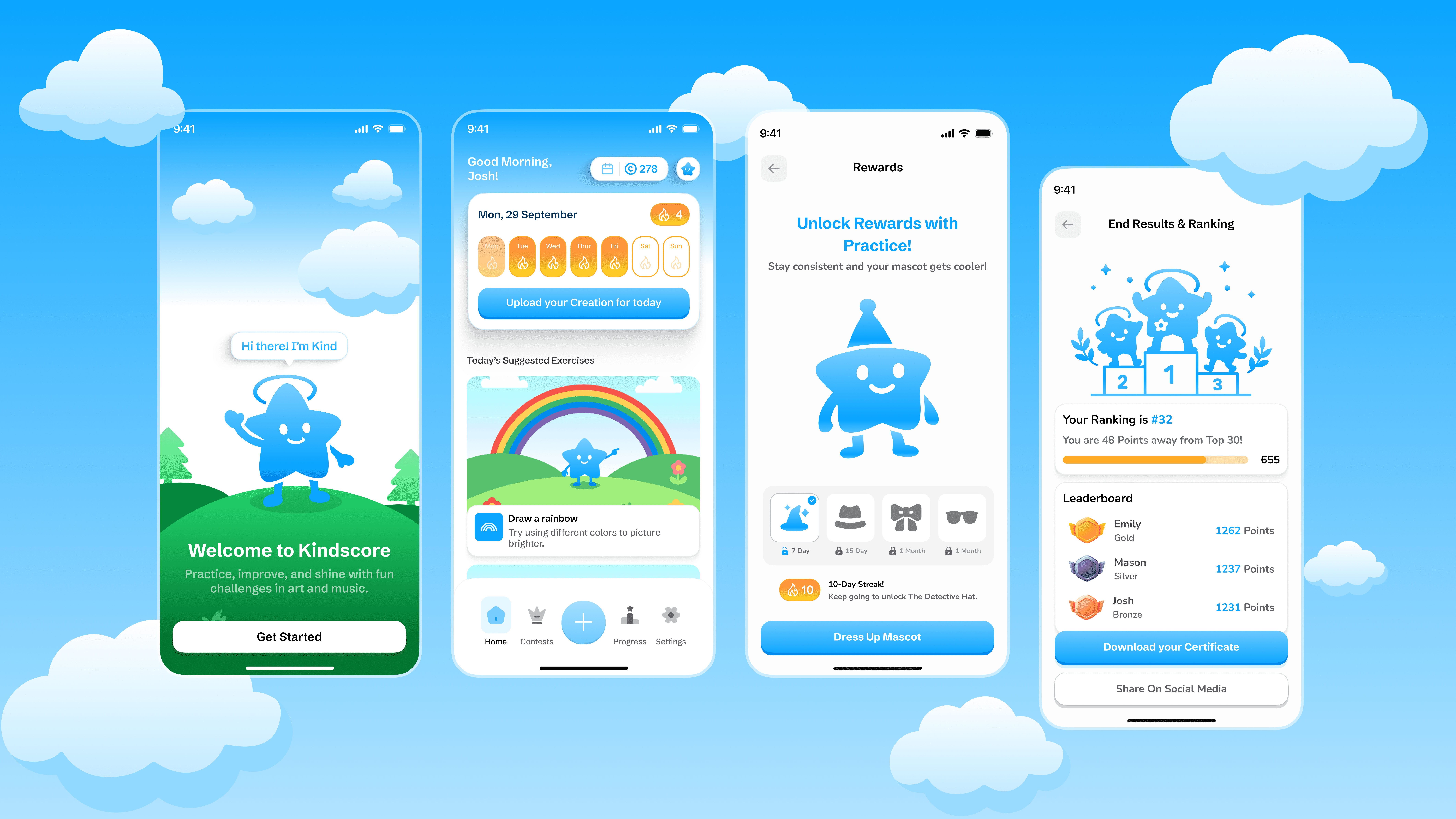 Kindscore needed a playful UI that works for kids and still reads as credible to parents. We designed the core loop (create → feedback → practice → progress), plus flows for streaks, contests, rewards, and a consistent mascot-led illustration system to carry the tone across the app.