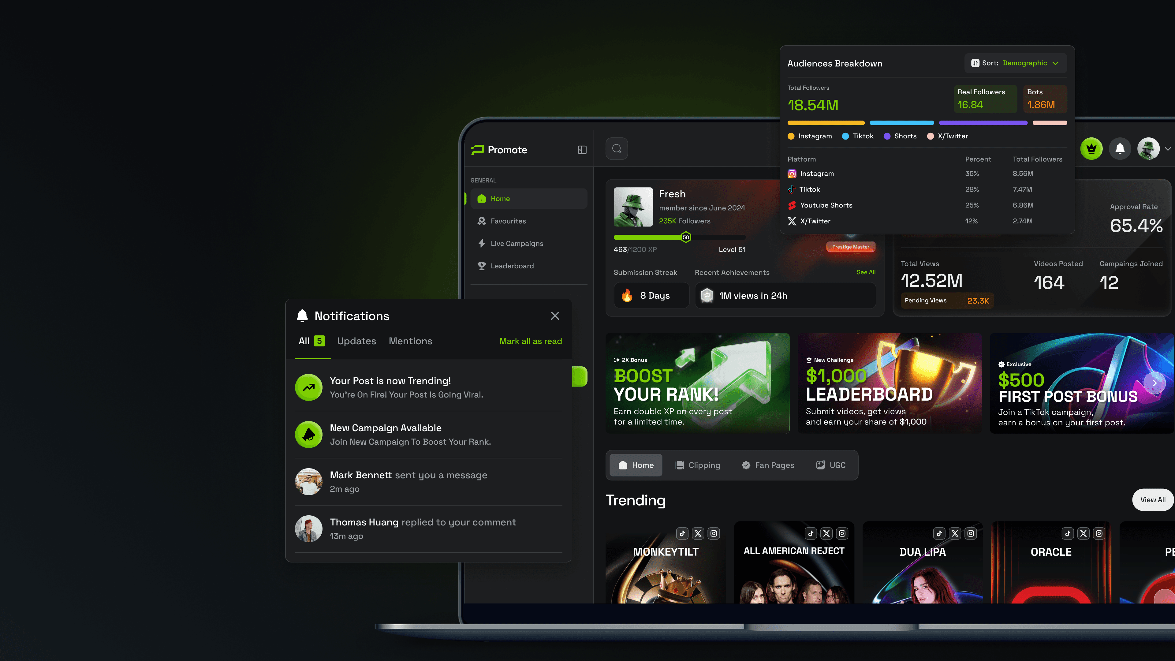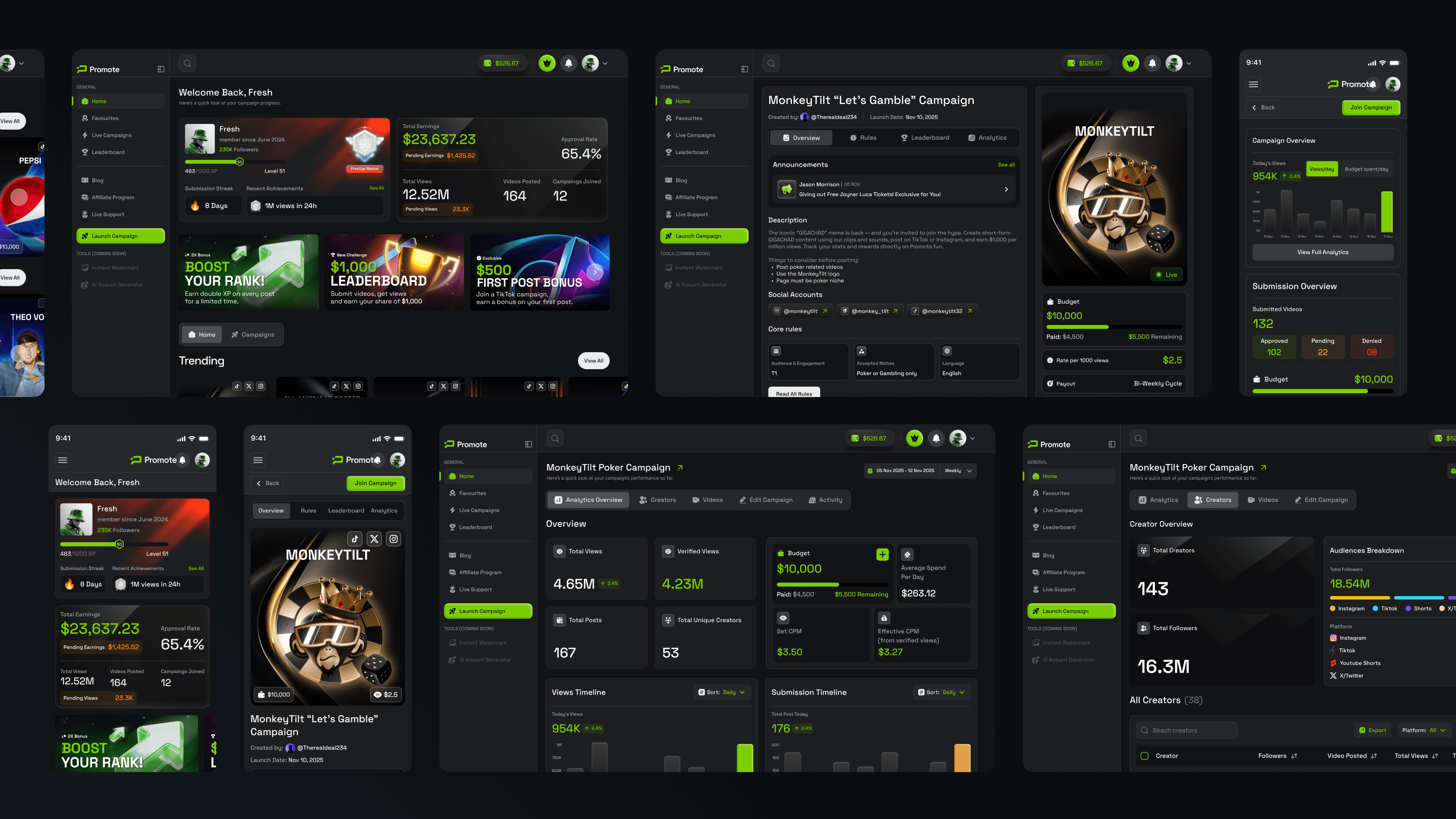 Promote shipped with a strong visual system built around dark surfaces, sharp contrast, and vivid green performance cues. The product scales across dashboard overviews, campaign details, creator analytics, notifications, and mobile campaign views, creating a consistent experience from high-level monitoring to granular decision-making. The result is a polished, high-energy platform that feels both premium and operationally clear.