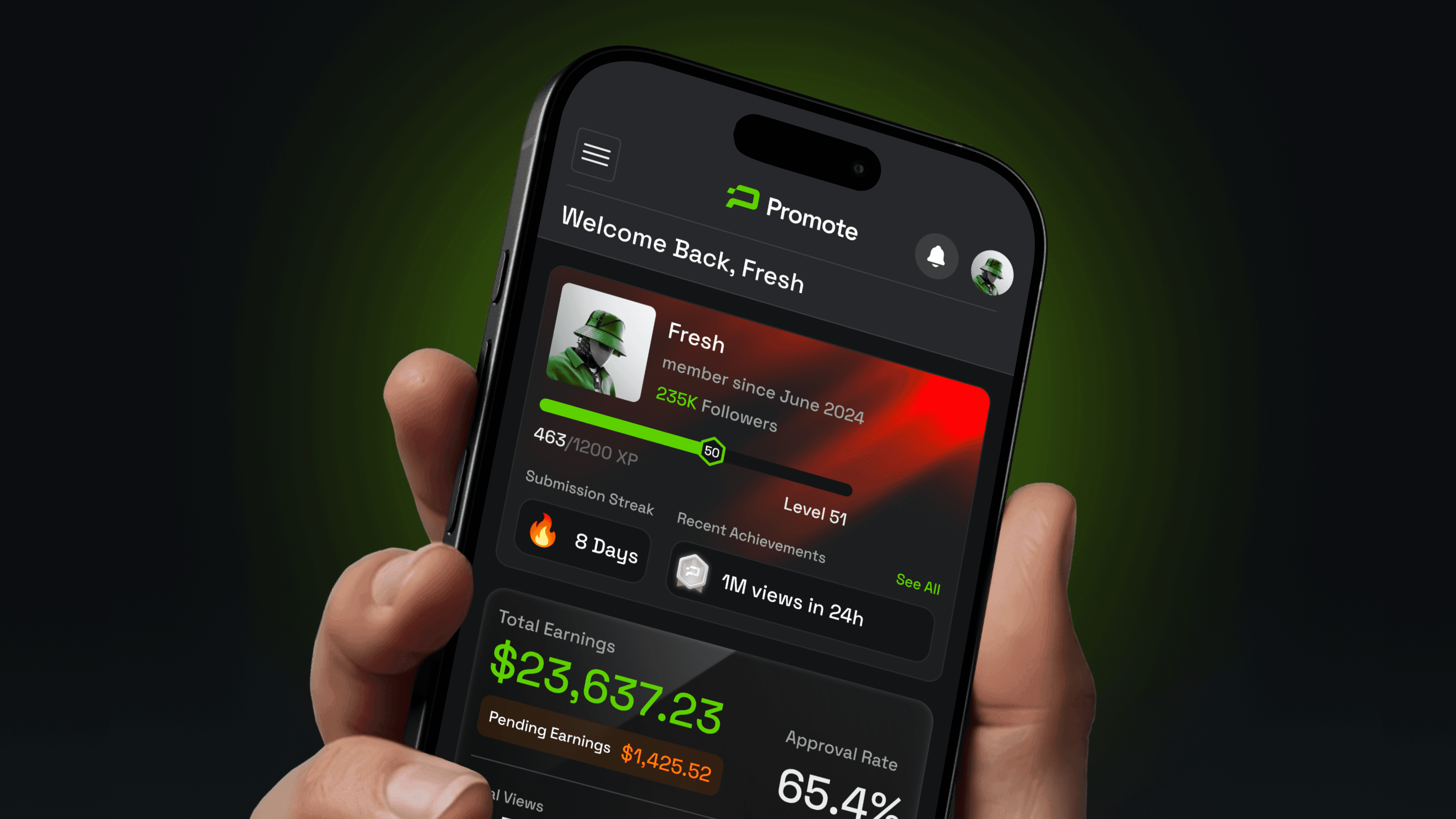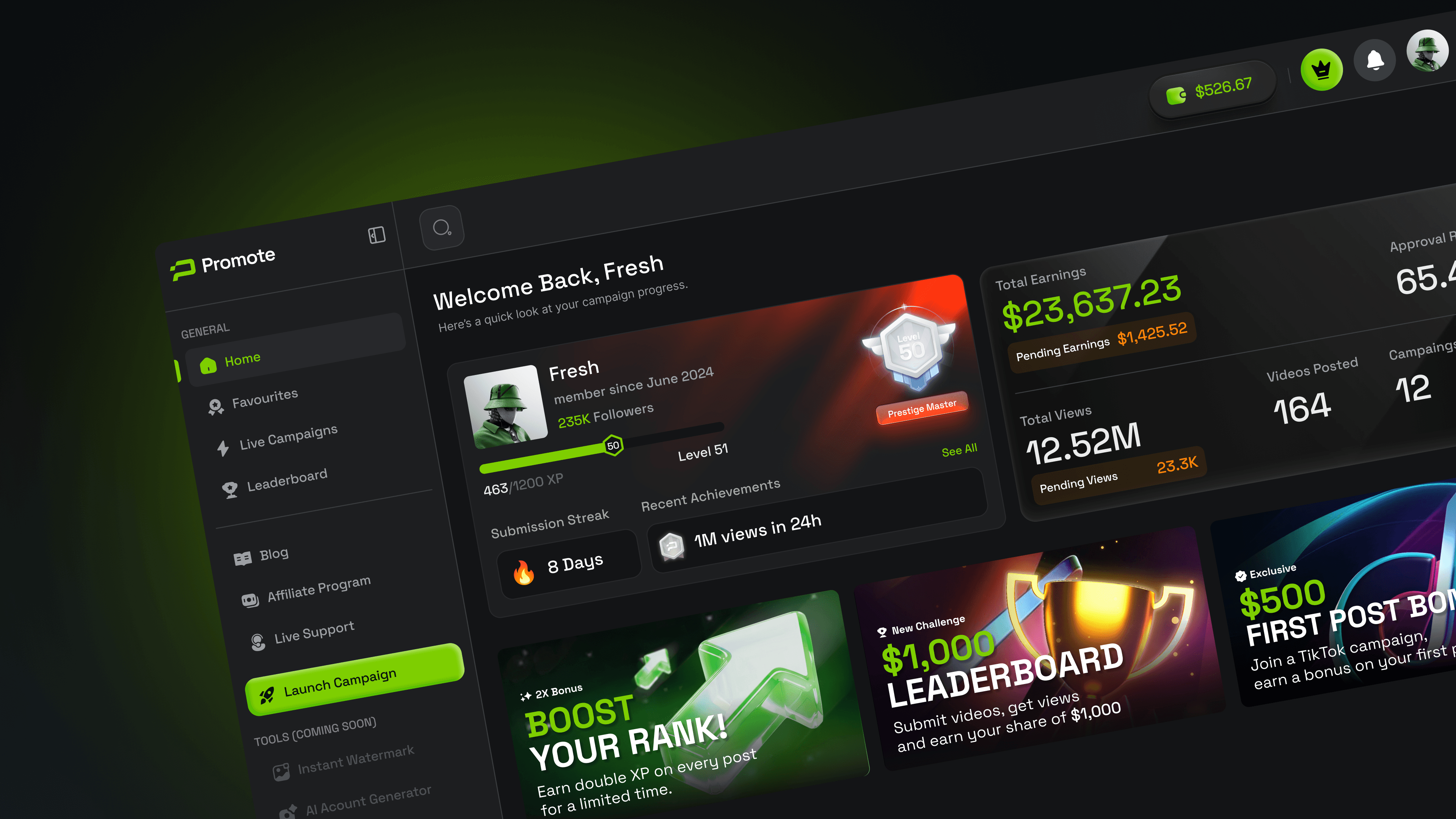 Promote is a campaign management platform built around creator-led growth. It gives teams and participants a clear view of campaign performance—covering budgets, submissions, approved and pending earnings, creator activity, audience breakdowns, and rankings across web and mobile. We designed the full product experience so campaign data feels immediate, actionable, and easy to navigate, even in a dense analytics environment.