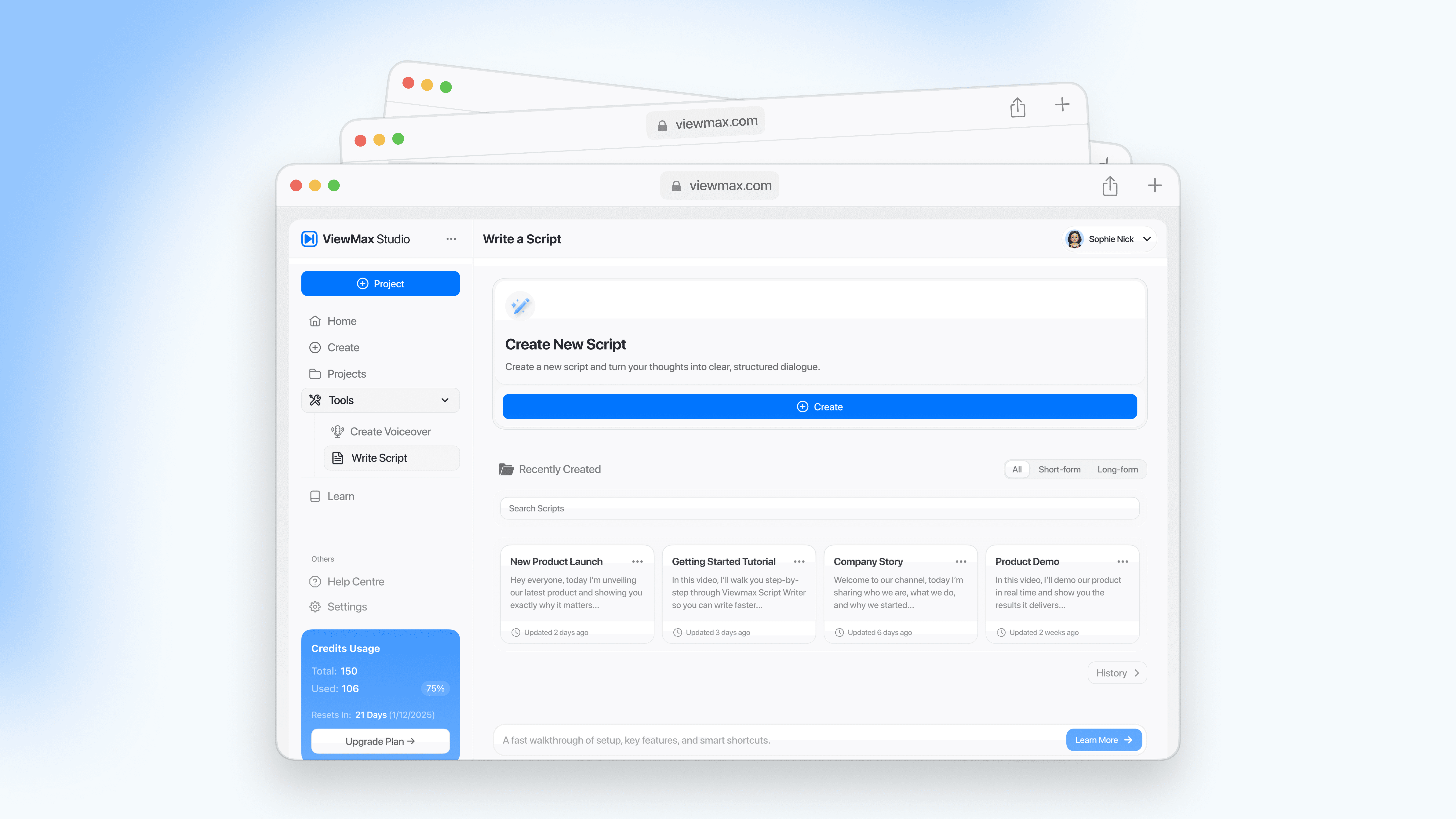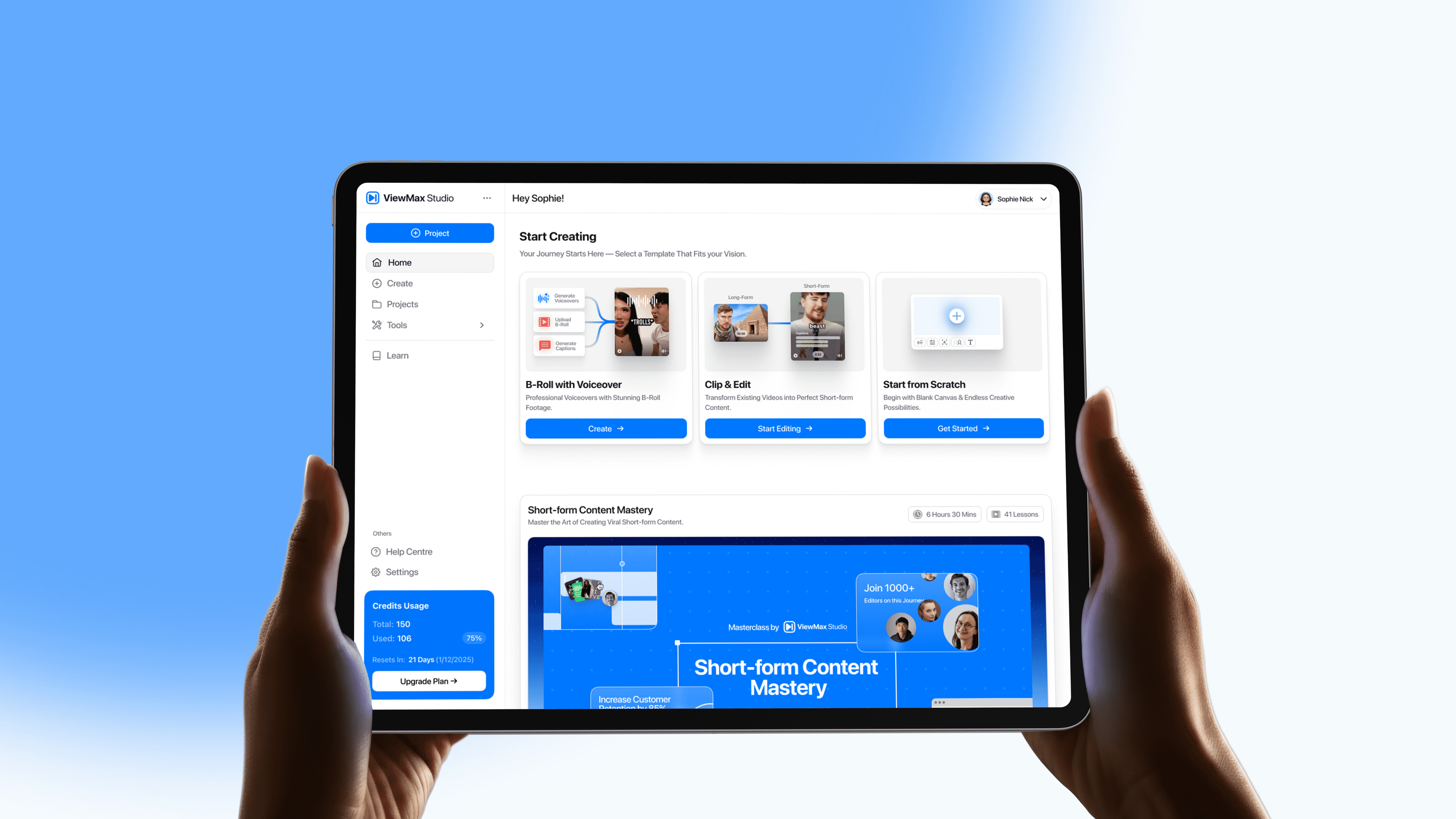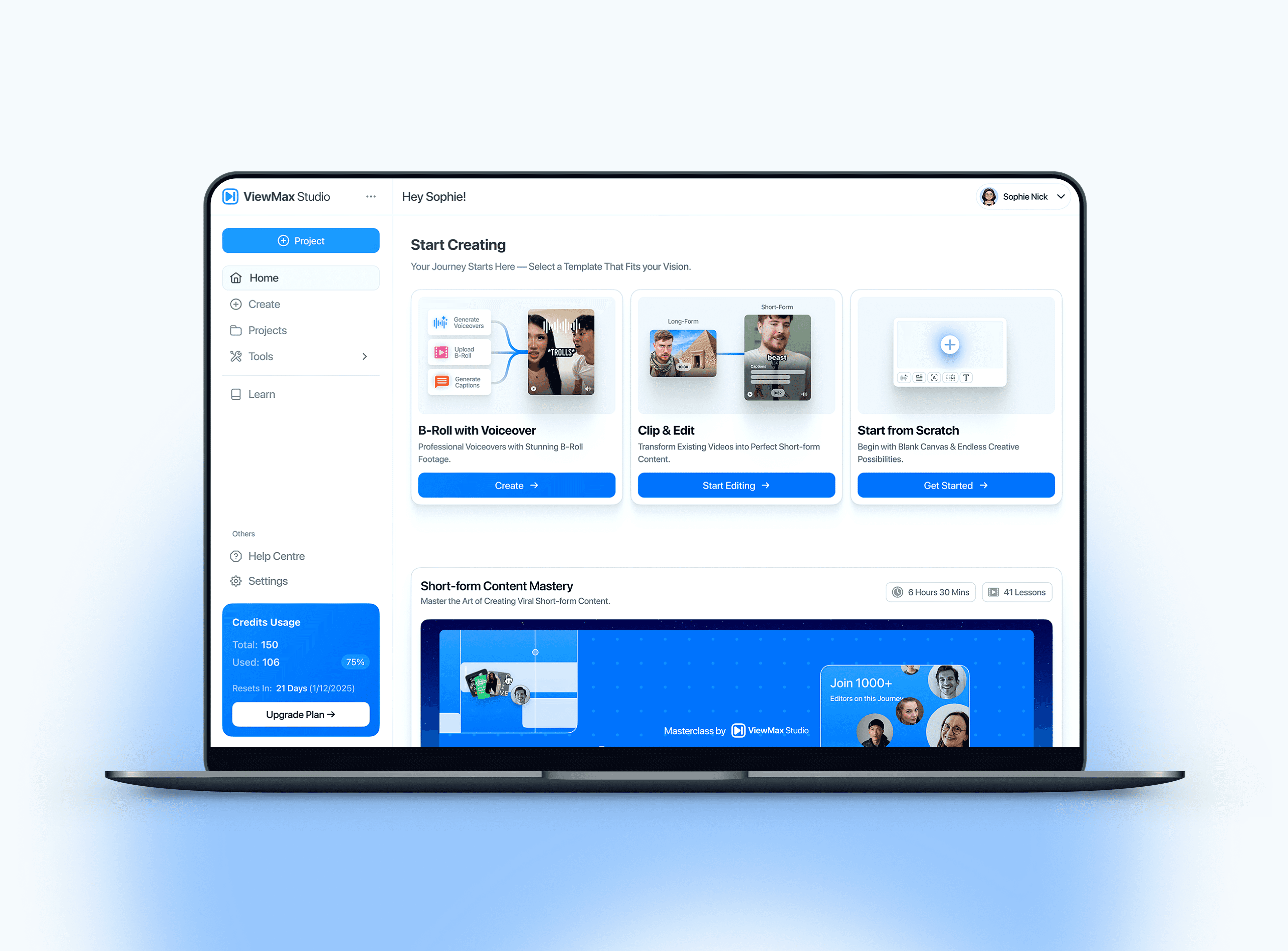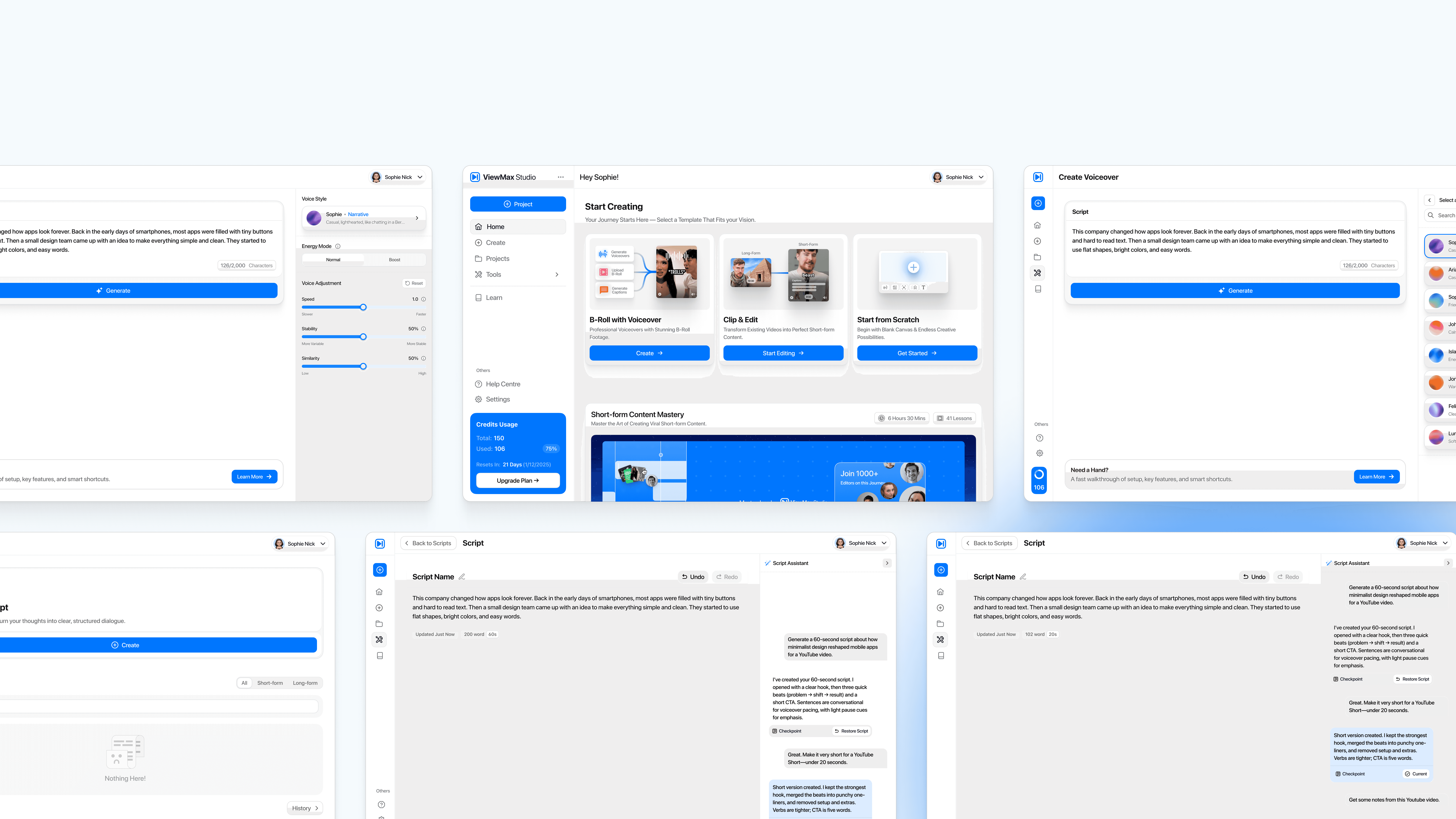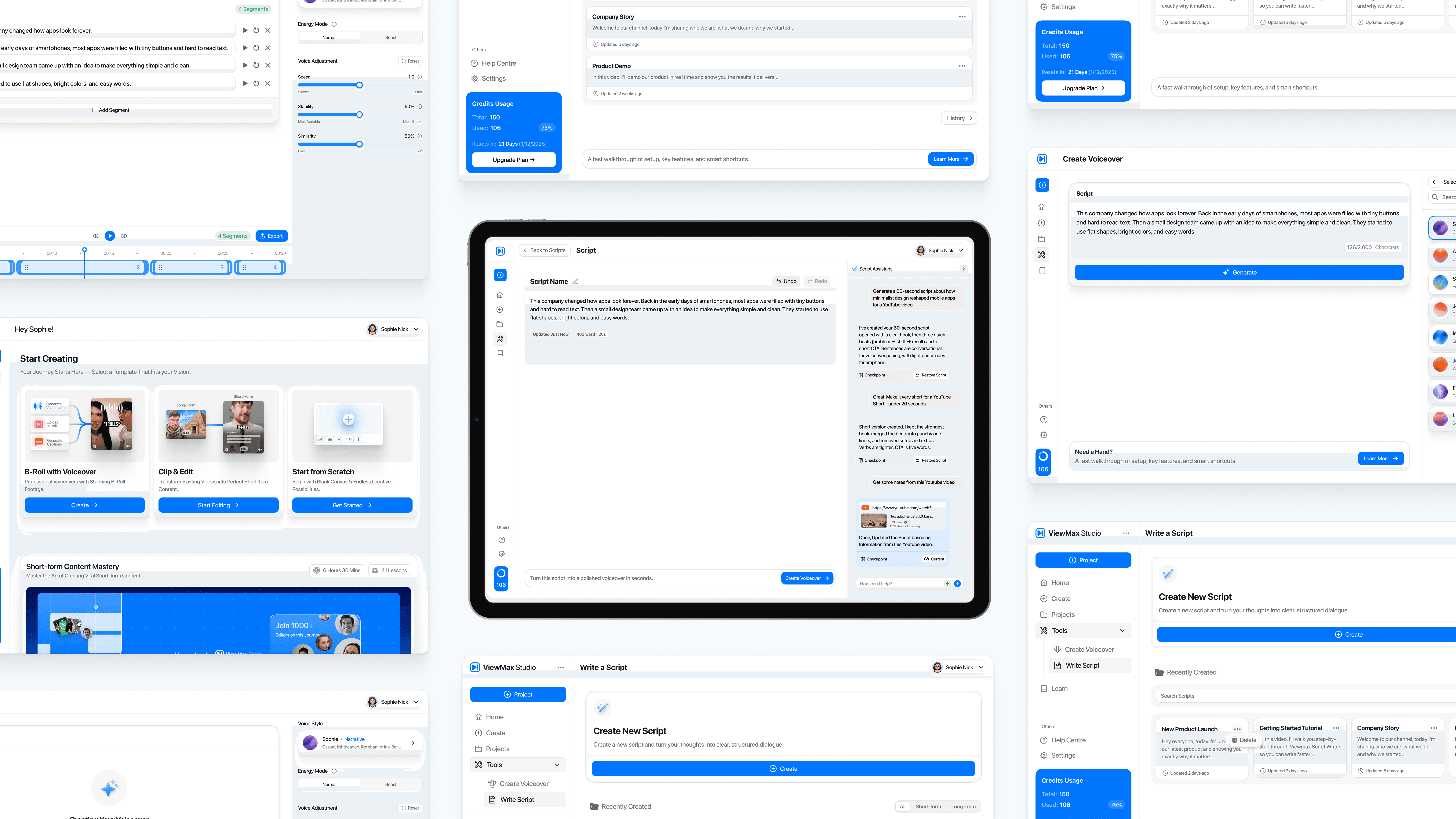 ViewMax needed a unified creator experience across key flows: a “Start Creating” hub with template entry points (B-roll with voiceover, clip & edit, start from scratch), dedicated tools for writing scripts and generating voiceovers, and clear account context (projects, learning, credits usage). We designed a consistent dashboard layout and component system that keeps actions obvious, reduces decision fatigue, and supports rapid iteration.