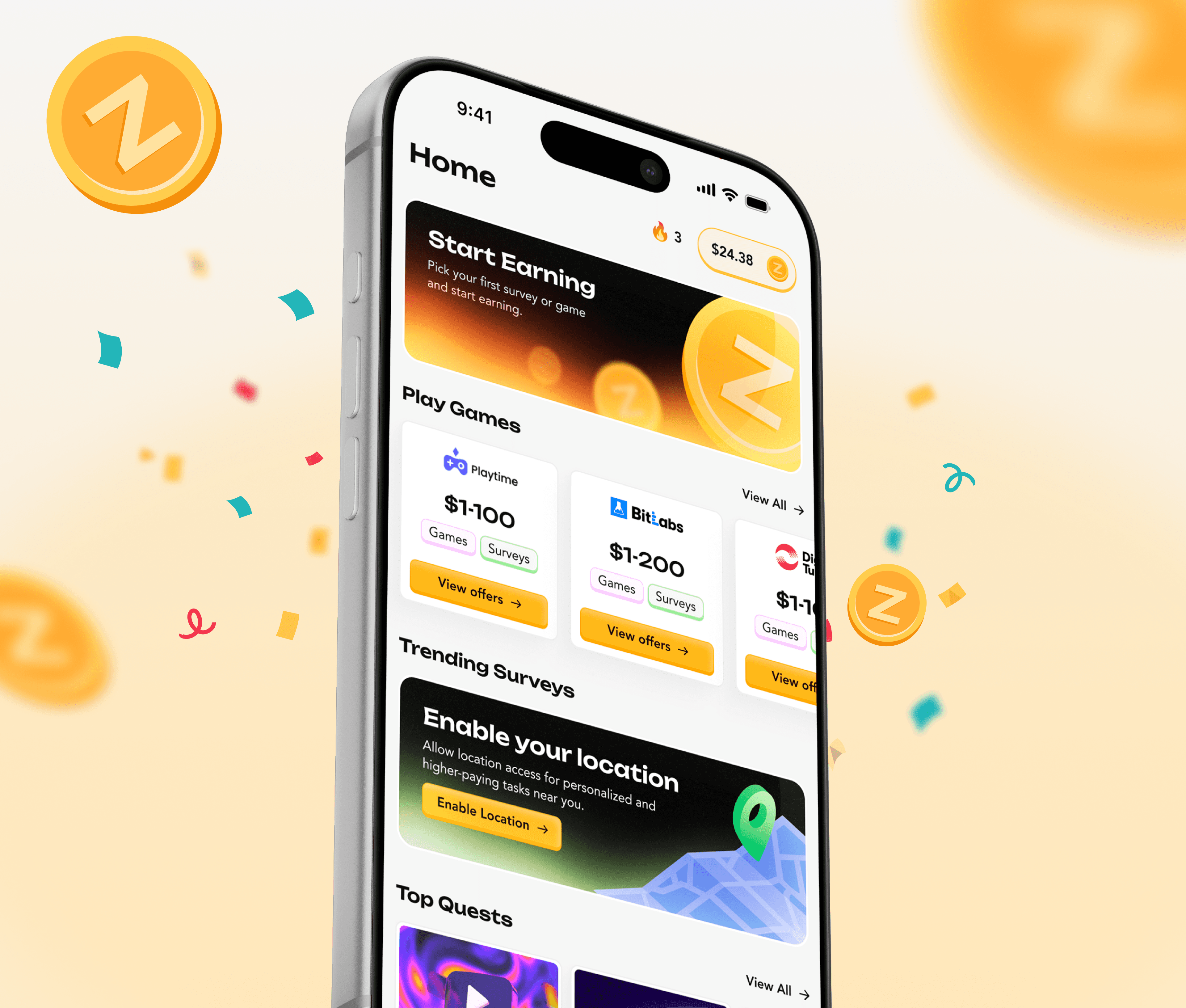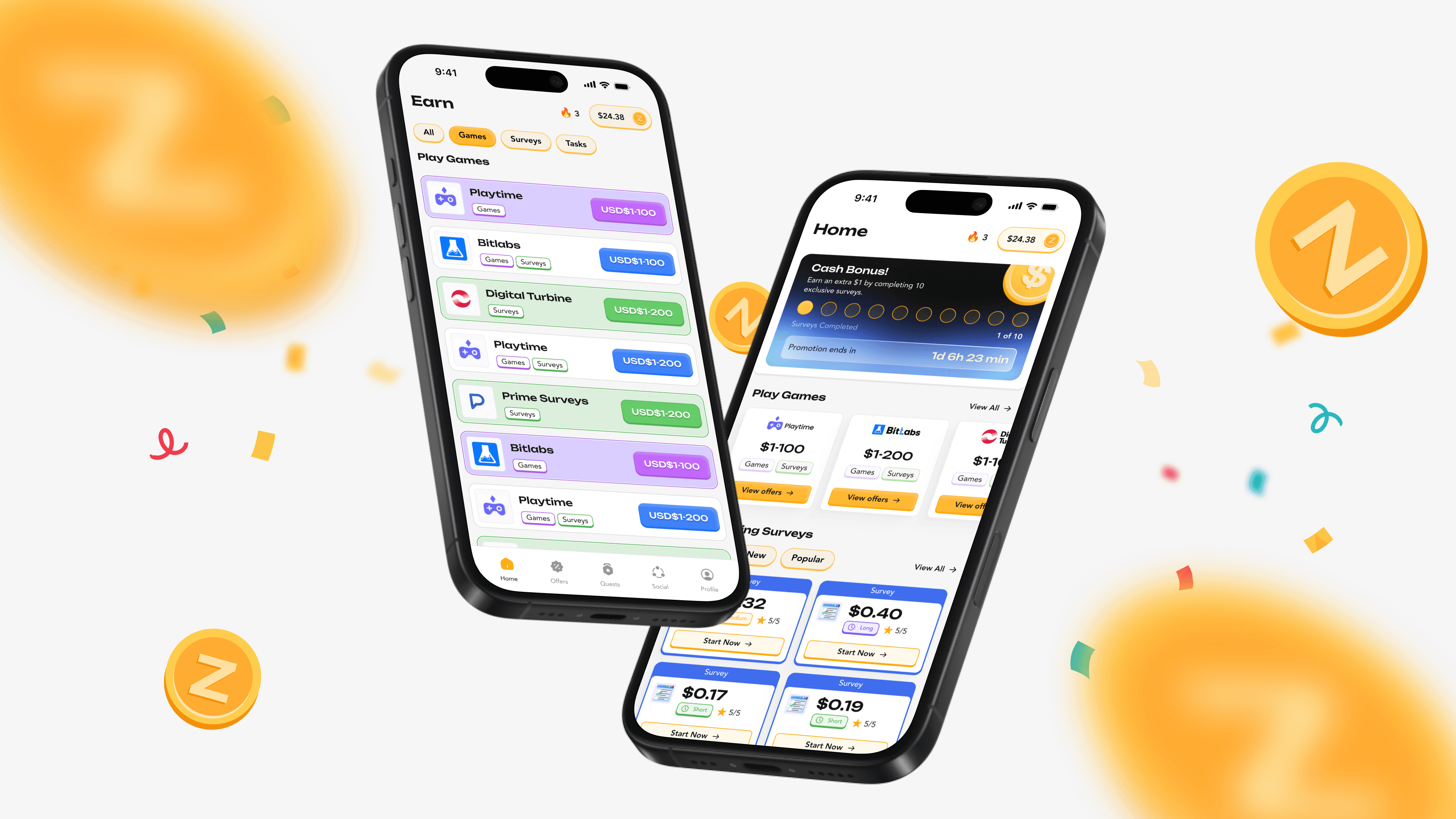 Zums is a rewards app where users earn through surveys, games, and tasks. We designed the full mobile experience and visual system—so offer discovery feels lightweight, progress feels motivating (bonuses, countdowns, entries), and payout states are always unambiguous from “in progress” to “successful.”