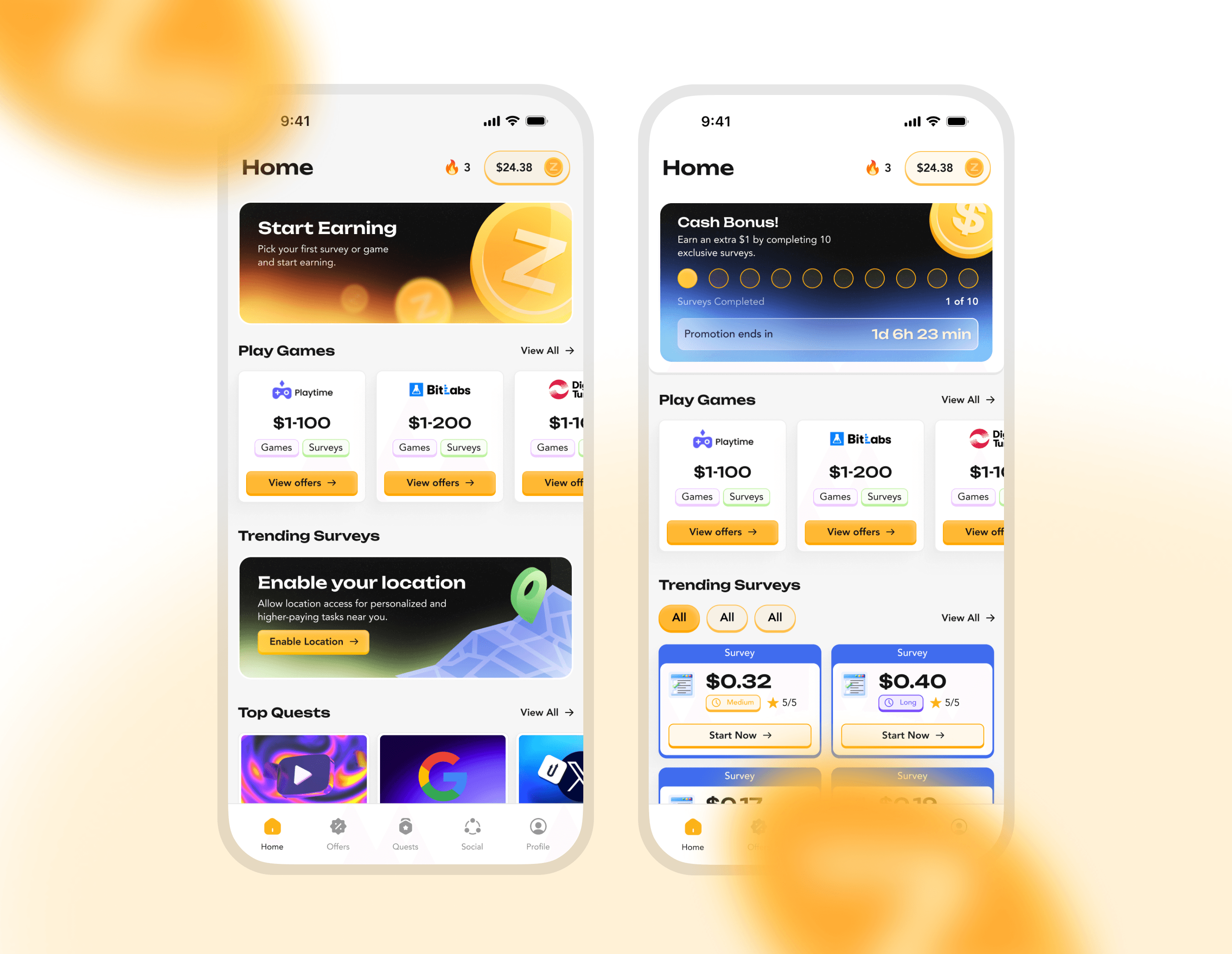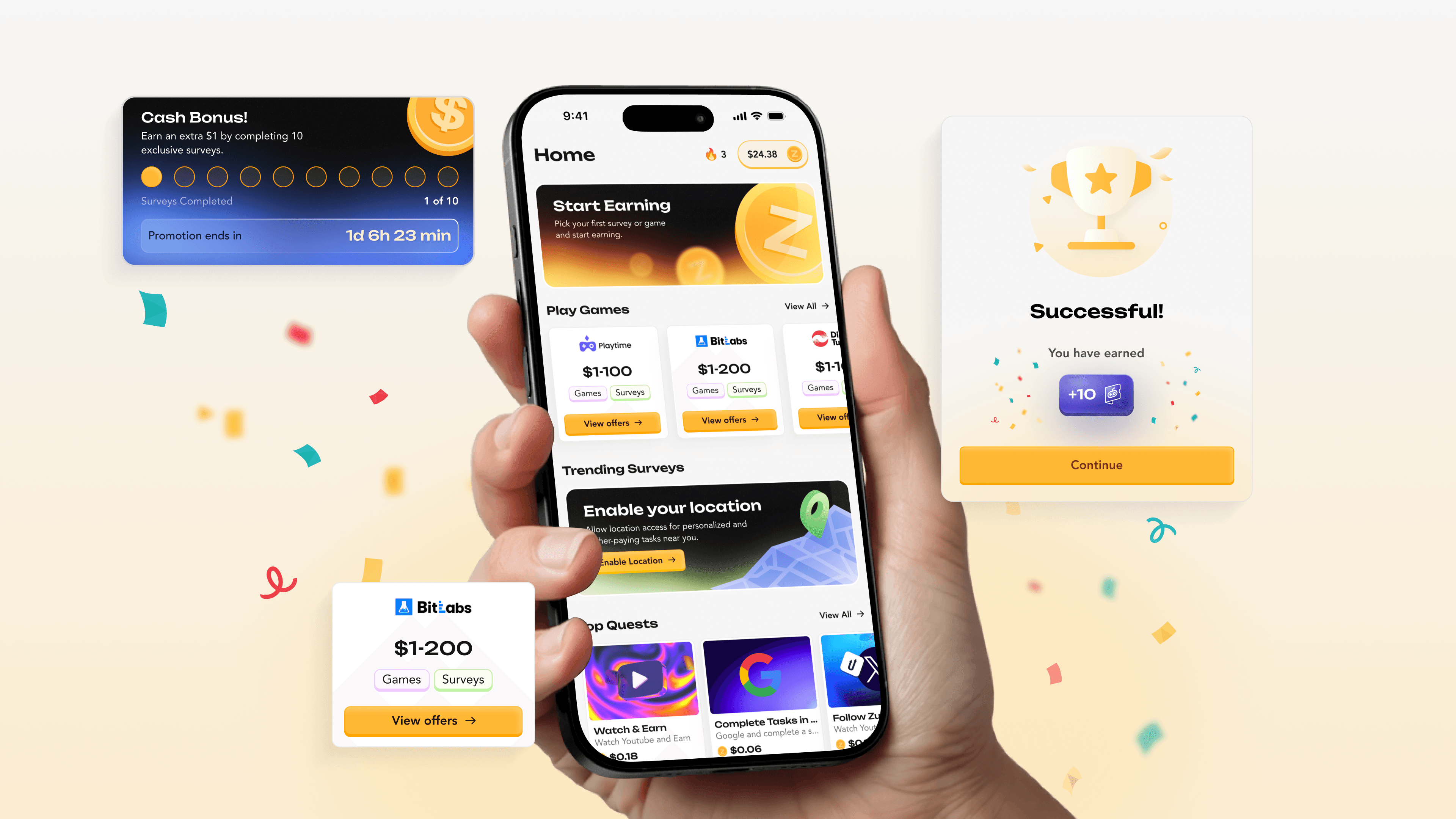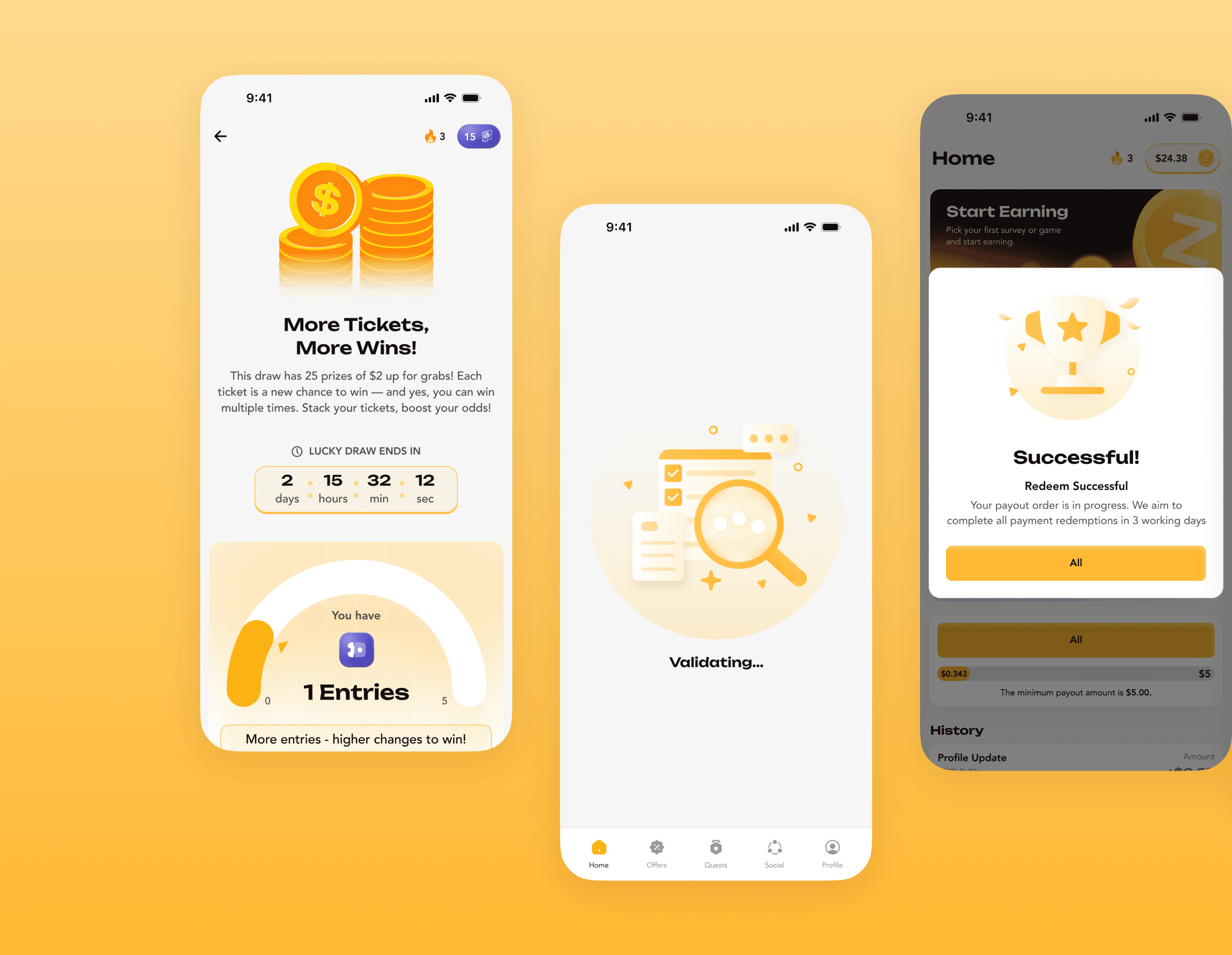 The goal was to reduce friction across the core journey: discover offers fast (Games / Surveys / Tasks), understand value at a glance (reward ranges and quick CTAs), and keep motivation high with visible progress (cash bonus tracker, timers, entries). We also designed key clarity moments—balance breakdown, minimum payout cues, and “validating / verifying / successful” states so users always know what’s happening and what to do next.