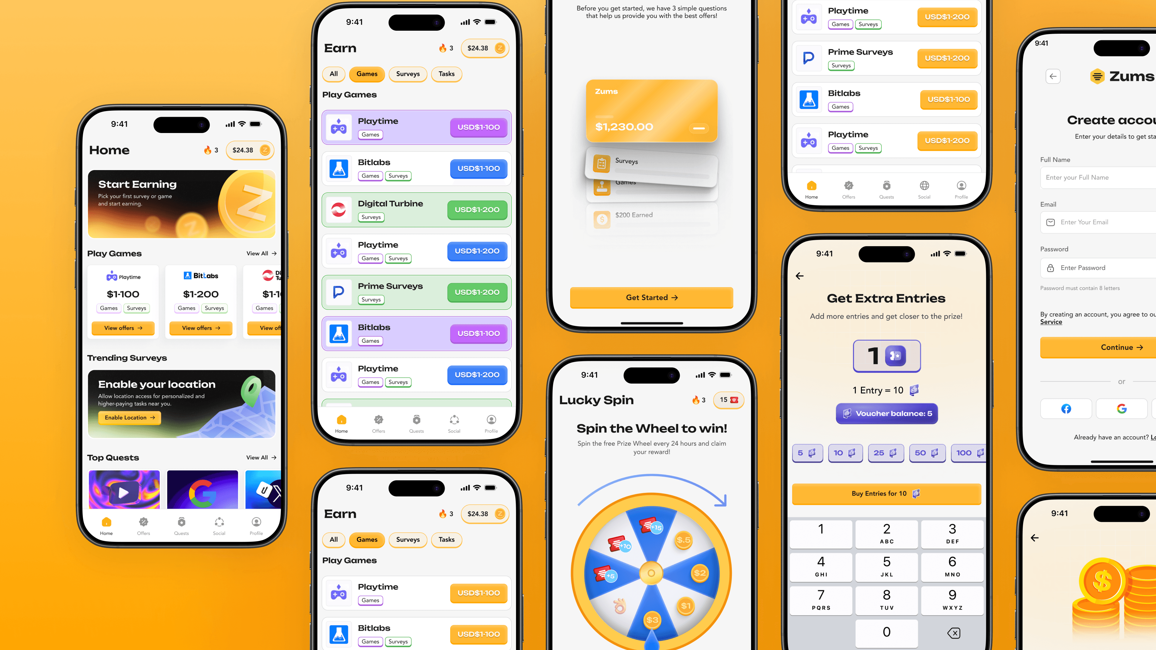Zums shipped with a cohesive brand direction and a modular UI system that scales across surfaces, from the Home dashboard to offer lists, wallet/balance views, and milestone moments (entries, lucky spin, redemption success). The result is an experience that feels light and fun, while still being precise about progress, status, and payout readiness.